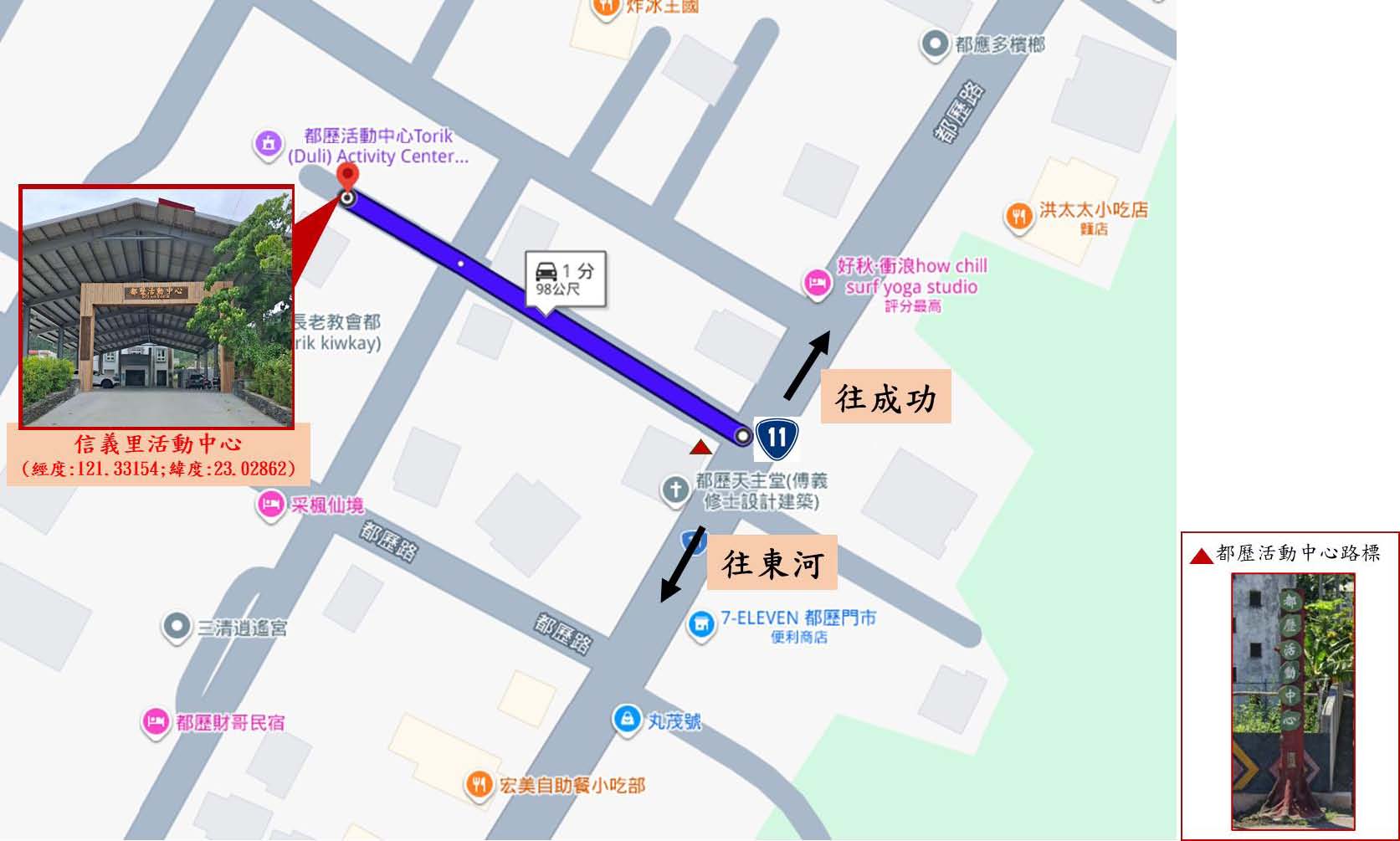 往北→走臺11線→見都歷活動中心路標,向左轉再前行約100公尺即可到達。